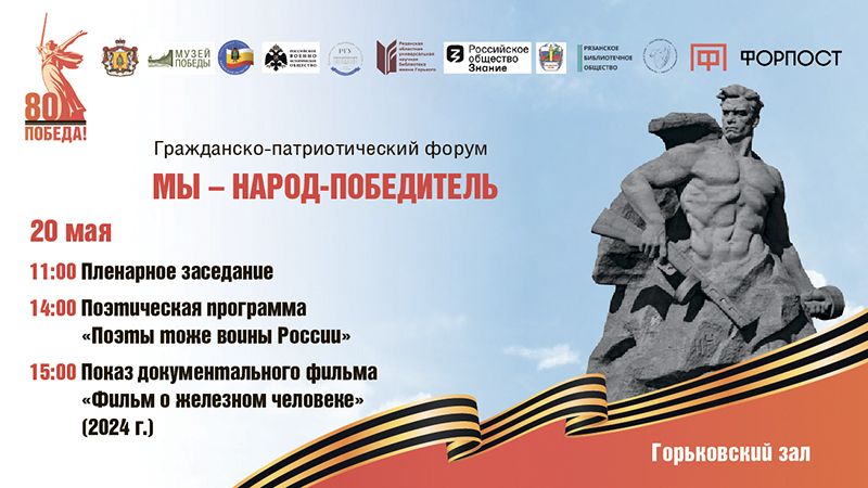 20 мая в Рязанской областной библиотеке имени Горького состоится Гражданско-патриотический форум «Мы – народ-победитель», посвященный 80-летию со Дня Победы в Великой Отечественной войне 1941–1945 гг.