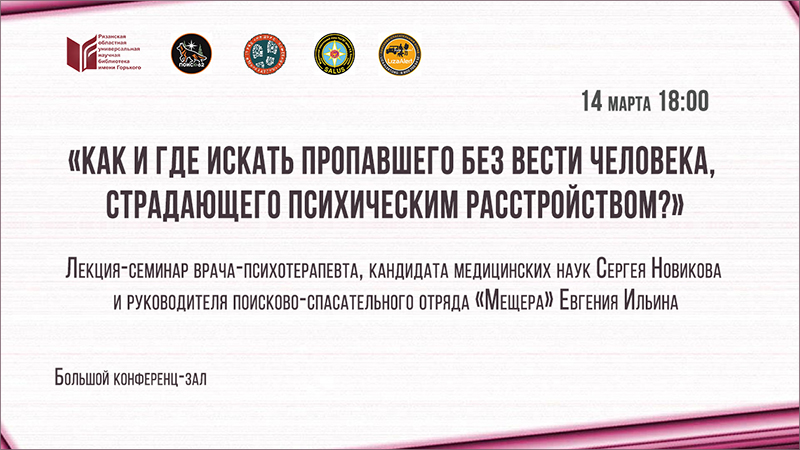 14 марта в 18:00 в Рязанской областной универсальной научной библиотеке имени Горького пройдет лекция врача-психотерапевта, кандидата медицинских наук Сергея Новикова «Как и где искать пропавшего без вести человека, страдающего психическим расстройством?». Мероприятие подготовлено совместно с поисково-спасательным отрядом «Мещера», кинологическим отрядом Рязанской области «Поиск-62», медицинским спасательным отрядом «SALUS» имени И.В. Васильева Рязанского государственного медицинского университета имени И.П. Павлова, добровольческим поисково-спасательным отрядом «ЛизаАлерт».