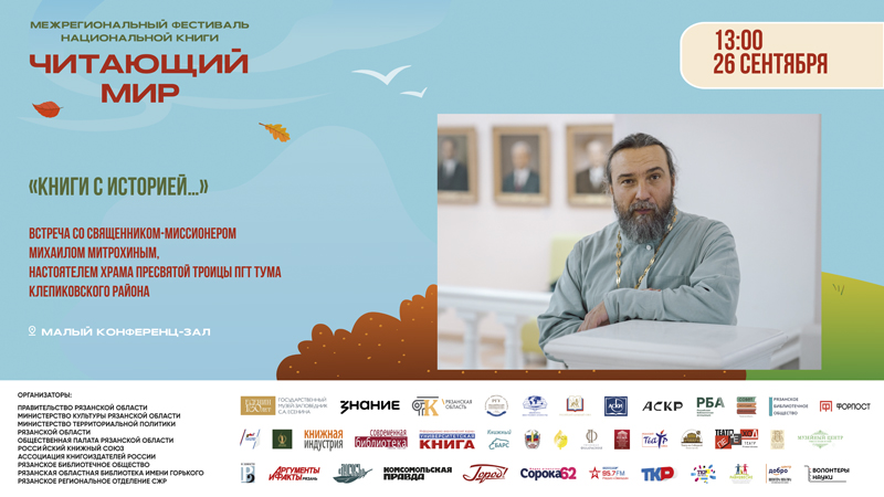 26 сентября в 13:00 в малом конференц-зале Рязанской областной универсальной научной библиотеки имени Горького в рамках Межрегионального фестиваля национальной книги «Читающий мир» пройдет встреча со священником-миссионером Михаилом Митрохиным, настоятелем храма Пресвятой Троицы пгт Тума Клепиковского района.