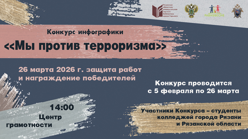 Рязанская областная универсальная научная библиотека имени Горького в соответствии с партнерскими планами с прокуратурой Рязанской области проводит конкурс инфографики «Мы против терроризма», посвящённый формированию активной жизненной позиции у студентов и воспитанию уважения к принципам мира, согласия и законности.