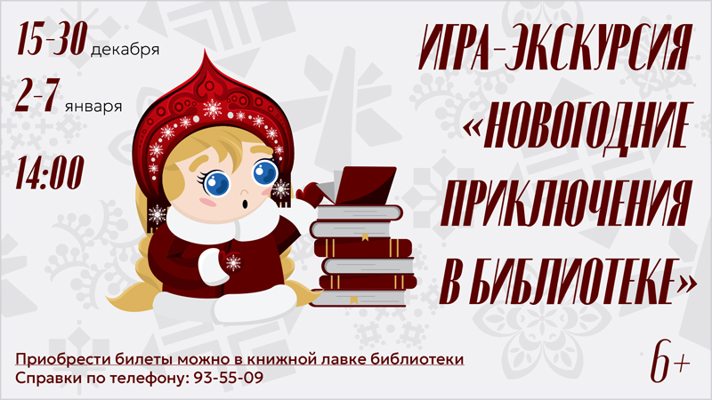 Ждем вас каждый день в 14:00 с 15 по 30 декабря 2025 года и со 2 по 7 января 2026 года. Билеты можно приобрести в Книжной лавке библиотеки, стоимость – 200 руб.