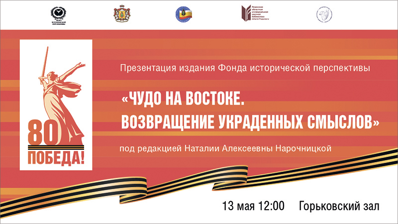 Горьковский зал 13 мая в 12:00 в Рязанской областной универсальной научной библиотеке имени Горького состоится онлайн-презентация уникального издания Фонда исторической перспективы, возглавляемого доктором исторических наук, общественным деятелем, членом Общественной палаты РФ Наталией Алексеевной Нарочницкой, «Чудо на Востоке. Возвращение украденных смыслов».