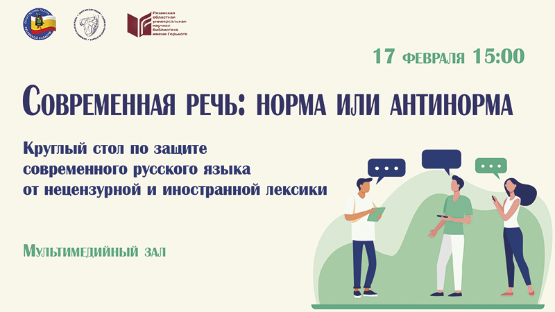 Мультимедийный зал 17 февраля в Рязанской областной универсальной научной библиотеке имени Горького состоится круглый стол по защите современного русского языка от нецензурной и иностранной лексики «Современная речь: норма или антинорма». Мероприятие подготовлено при поддержке Общественного совета Министерства культуры РФ, Общественной палаты Рязанской области и Рязанского областного совета женщин.