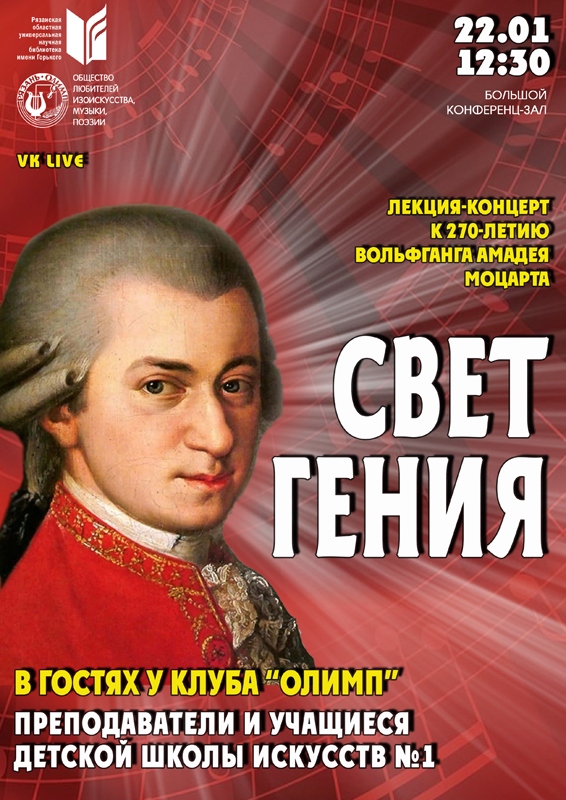 22 января в молодежной секции клуба «ОЛИМП» состоится лекция-концерт «Свет гения», посвященная 270-летию со дня рождения австрийского композитора и музыканта-виртуоза В. А. Моцарта.