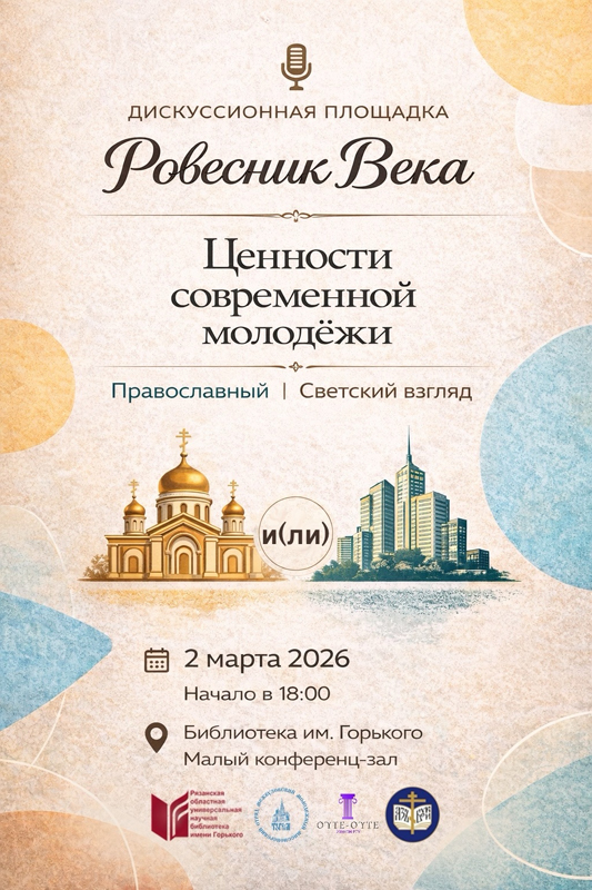 Дискуссионная площадка «Ровесник века», организуемая при поддержке библиотеки имени Горького и Молодежного отдела Рязанской епархии, приглашает всех желающих обсудить тему «Ценности современной молодежи: православный и светский взгляд».