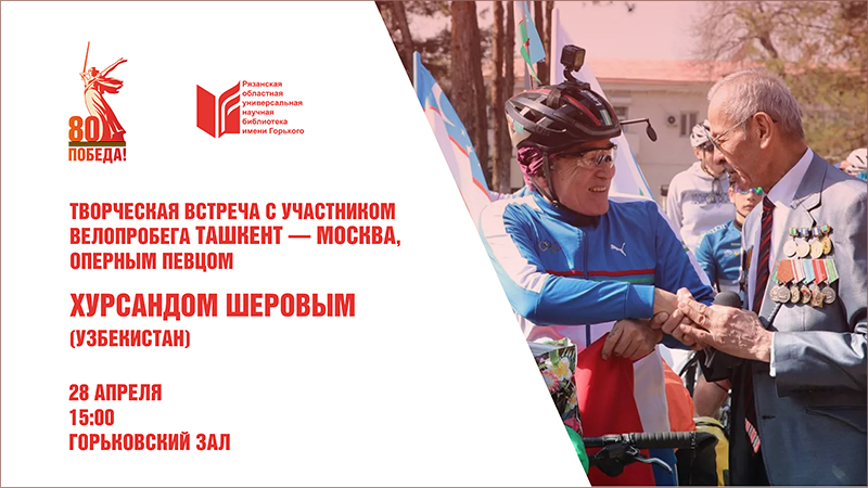 В библиотеке состоится встреча с участниками велопробега Ташкент ‒ Москва, посвященного 80-летию Победы в Великой Отечественной войне. Известный певец и велопутешественник Хурсанд Шеров преодолеет 3800 км, пересекая территории Узбекистана, Казахстана и России. На маршруте к нему присоединились единомышленники Жумабай Утаргалиев и Кайрат Иргизбаев (Казахстан).
