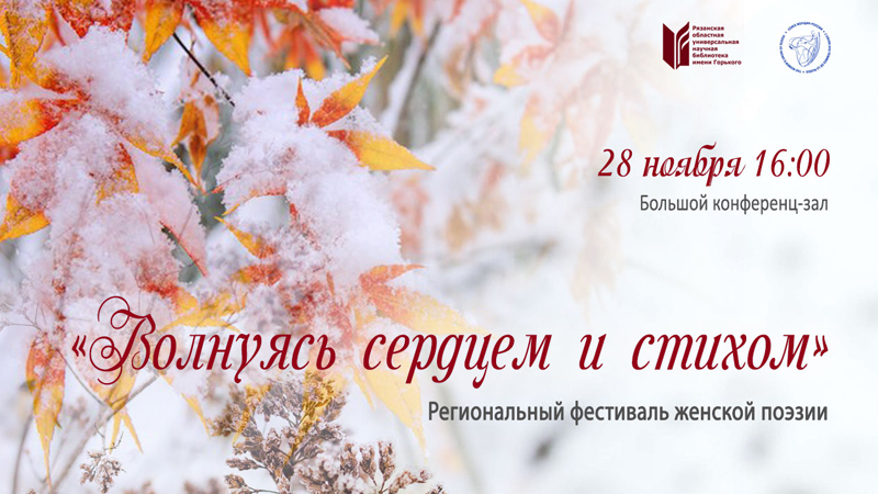 Ежегодный фестиваль «Волнуясь сердцем и стихом», организованный совместно с Рязанским областным Советом женщин, состоится 28 ноября в библиотеке имени Горького. Он соберет под одной крышей представительниц рязанских литературных объединений: Союза писателей России, Союза российских писателей, Российского союза профессиональных литераторов, Союза литераторов России, а также литературного объединения «Волна» Государственного Рязанского приборного завода и поэтического клуба «Автор». Вас ждут как премьеры – свежие, еще не звучавшие стихи, так и те произведения, которые уже успели завоевать любовь и признание читателей.
