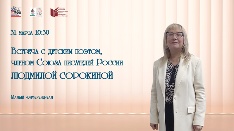 В рамках Всероссийской недели детской книги в библиотеке состоится встреча с детским поэтом, членом Союза писателей России Людмилой Сорокиной.