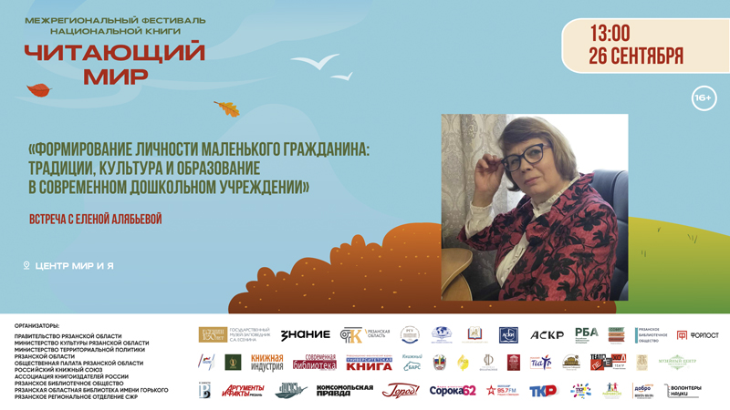 В рамках Межрегионального фестиваля национальной книги «Читающий мир» 26 сентября в Рязанской областной универсальной научной библиотеке имени Горького пройдет встреча с Еленой Алябьевой «Формирование личности маленького гражданина: традиции, культура и образование в современном дошкольном учреждении».