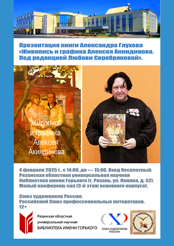 В Рязанской областной универсальной научной библиотеке имени Горького состоится презентация книги известного московского историка, писателя, художника и искусствоведа Александра Глухова «Живопись и графика Алексея Акиндинова». Издание опубликовано под редакцией преподавателя Государственного университета просвещения Любови Серебряковой, автора учебно-методических пособий по изобразительному искусству.