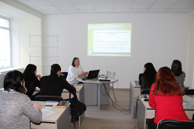 В библиотеке имени Горького с 11 по 31 октября прошли пять занятий со студентами 1-го курса на тему «Оформление списка литературы к научной работе». Первокурсников ознакомили с информационными возможностями официального сайта библиотеки, справочно-библиографическим аппаратом, ресурсами удаленного доступа, виртуальной справочной службой КОРУНБ.