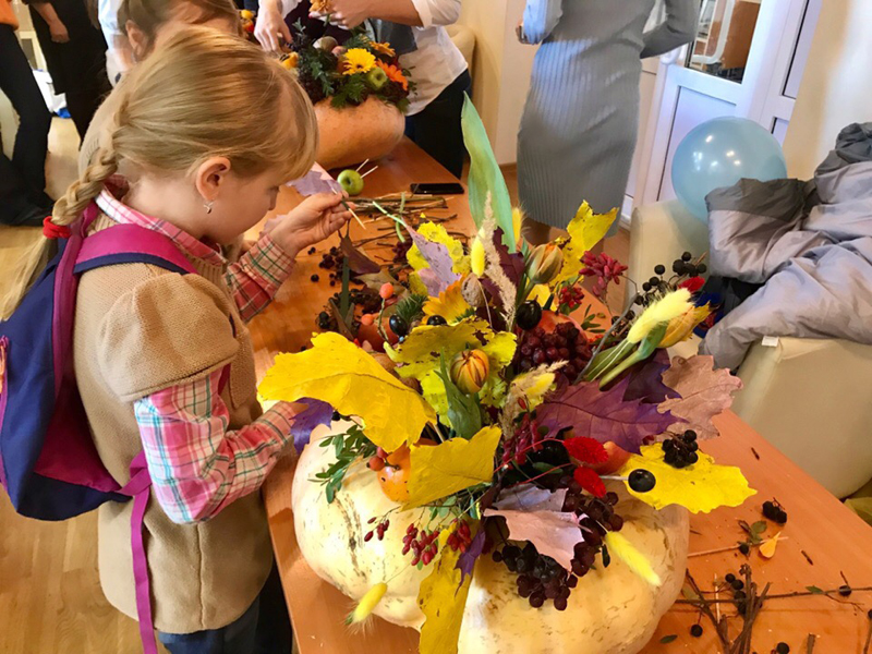 Интересно и увлекательно была выстроена развлекательная программа: анимационные игры, конкурсы, шоу мыльных пузырей. Эмоционально отреагировала детвора на выступление клуба артистического фехтования «Вольные бойцы». С большим увлечением дети и взрослые приняли участие в мастер-классе по созданию красивых осенних композиций из тыквы, фруктов, осенних цветов, которые они с благодарностью подарили Н.Н. Гришиной.