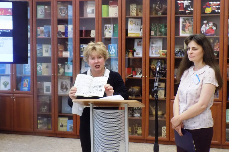 Выступление Л. А. Королевой сопровождалось показом слайдов. Книга, вышедшая в 2017 году на русском и итальянском языках, посвящена героическим дням Сопротивления итальянского народа. Советские солдаты, бежавшие из плена, плечом к плечу с итальянскими партизанами сражались за освобождение Италии от гитлеровского фашизма и от фашизма Муссолини. Книга составлена на основе воспоминаний советских партизан с использованием архивных документов. При ее написании помощь оказали итальянские коллеги. Л. А. Королева преподнесла в дар библиотеке книгу «Al tempo dei partigiani» («В партизанские времена») на итальянском языке.