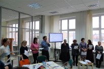 Особый успех имела активная смена видов деятельности в процессе работы: участники работали в парах и мини-группах, обсуждали педагогические и методические вопросы в формате пресс-конференции и брифинга, просматривали видео с новым лексическим материалом, обучали друг друга и делились опытом, читали и обсуждали тексты по принципу информационного пробела и писали нон-стоп диктант.