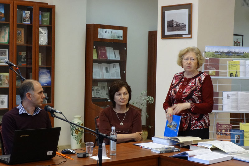 Своими впечатлениями о книге поделилась заслуженный работник культуры Валентина Васильевна Безуглова. Отметив огромную исследовательскую работу, проведенную автором в московских архивах, она пожелала ему продолжать творческий поиск, поработать с документами в ГАРО, библиотеке РИАМЗ, познакомиться с рязанскими историками. Валентина Васильевна рассказала о книжных документах, находящихся в фонде краеведческого отдела библиотеки.