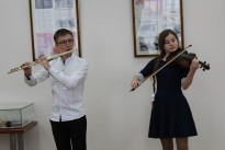 Открыли выставку активисты движения «Волонтеры Победы» Никита Маскин, студент Рязанского радиотехнического университета, и Маргарита Якимова, ученица 11 класса школы №39, которые исполнили дуэтом на флейте и скрипке мелодию Матвея Блантера «Катюша».