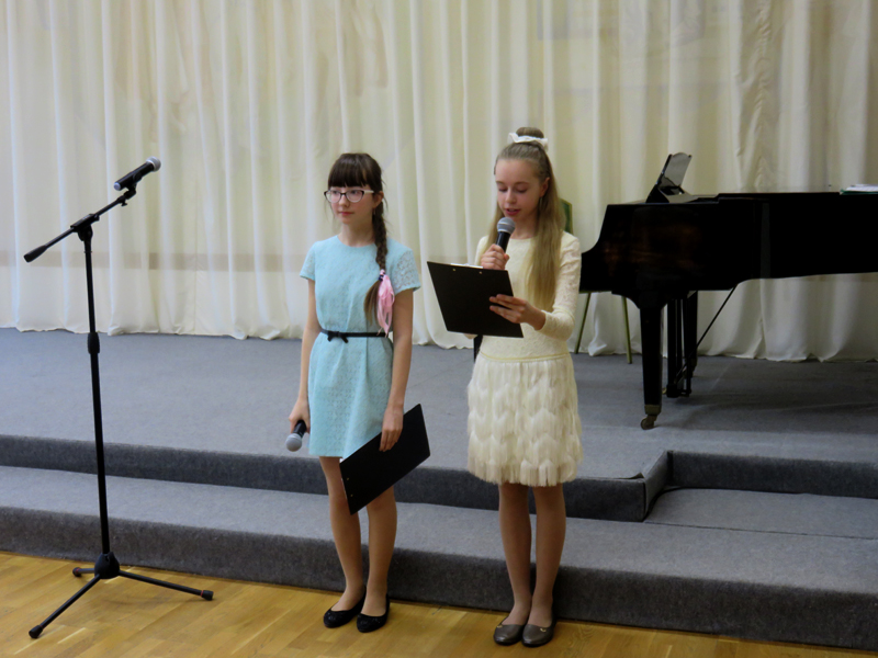Программу подготовила заведующая хоровым отделом школы Е.П. Романова. А две очаровательные ведущие - Алиса Пантюшева и Анастасия Грибкова - замечательно представили соединенные в единую композицию текстовой материал, стихотворения и музыкальные номера.