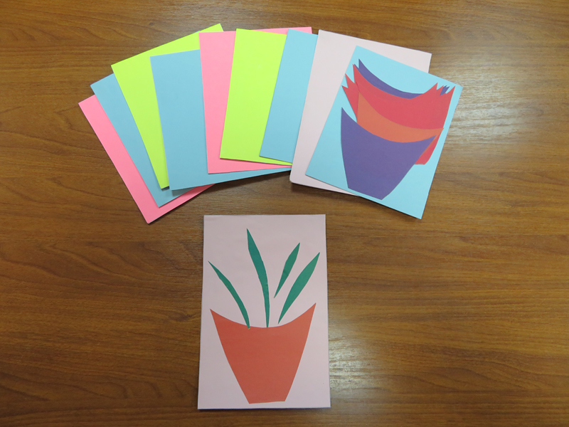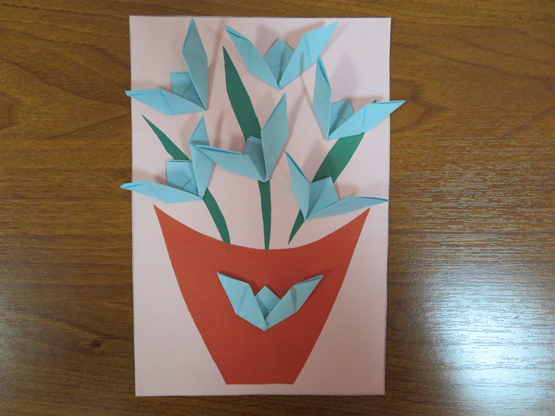 Для работы вам понадобятся: цветной картон для основы, зеленая бумага для листьев и стеблей, голубая бумага для цветов, ножницы и клей-карандаш. Для выполнения работы вам необходимо следовать пошаговой инструкции.