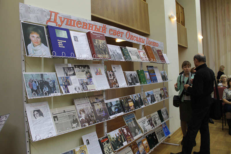 Привлекла внимание участников вечера выставка «Душевный свет Оксаны Гоенко», подготовленная сотрудниками библиотеки. Художественные книги, тематические журналы, фотоальбомы, подготовленные к печати и изданные ею в качестве директора издательства «Пресса», а позднее – издательства «РИД», активно используют в работе читатели областной научной универсальной библиотеки им. Горького.