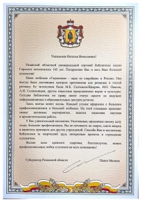 Почетным гостем праздника стала министр культуры Рязанской области Марина Владиславовна Кауркина. Она передала директору библиотеки, заслуженному работнику культуры РФ Наталье Николаевне Гришиной поздравительный адрес от Губернатора Рязанской области Павла Викторовича Малкова, а также ценный подарок – великолепно изданную книгу «Россия. Великая судьба», которая, безусловно, займет почетное место в фонде библиотеки. В поздравительном адресе Губернатор особенно отметил, что библиотека по праву носит статус одного из ведущих информационных и образовательных центров региона: «Здесь всегда кипит жизнь. На этой площадке проходят самые значимые мероприятия, ведется серьезная научная и просветительская работа». Марина Владиславовна сказала добрые слова в адрес директора и коллектива библиотеки, пожелала творческого вдохновения, интересных замыслов и успехов в их претворении в жизнь.