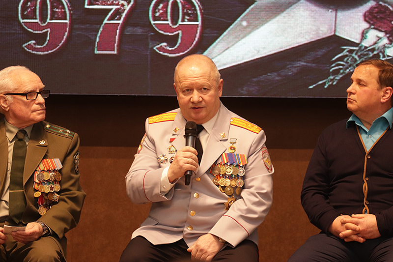 Своими воспоминаниями и видением афганских событий поделились присутствующие на вечере ветераны-афганцы. Это генерал-майор милиции в отставке Ю.К. Плугин, полковник милиции в отставке В.Ф. Вербовецкий, полковник милиции в отставке С.Н. Муравьев, подполковник милиции в отставке О.Ю. Кузнецов, полковник полиции в отставке Ю.А. Серегин, полковник в отставке А.Е. Стефанов, подполковник запаса А.П. Филатов и майор запаса В.В. Барабаш.