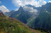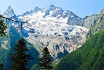 Знаменитая Домбайская поляна, венчающая ущелье реки Теберды, расположена в месте слияния трех речек, порожденных ледниками Домбайской стены.
