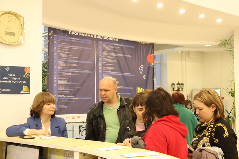 В холле первого этажа библиотеки работал открытый микрофон «Читаем о России», где каждый участник «Библионочи» мог попрактиковаться в чтецком мастерстве, книжная выставка «Традиции живая нить», фотовыставка «Россия. Полет через века». Увлекательный квест «По следам янтарной комнаты» собрал большое количество участников. Подкрепить силы можно было в буфете «Пешков».