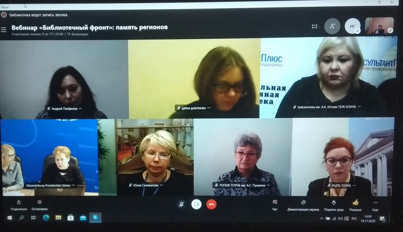 Участниками вебинара «Библиотечный фронт»: память регионов», прошедшего в приложении Skype на базе Свердловского регионального центра Президентской библиотеки, стали специалисты федеральных, республиканских и областных библиотек Санкт-Петербурга, Кузбасса, Томска, Новосибирска, Кургана, Саратова, Югры, Биробиджана, Республики Крым, Рязани, Твери и Тамбова.