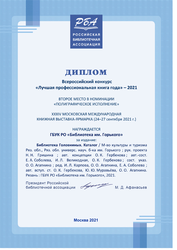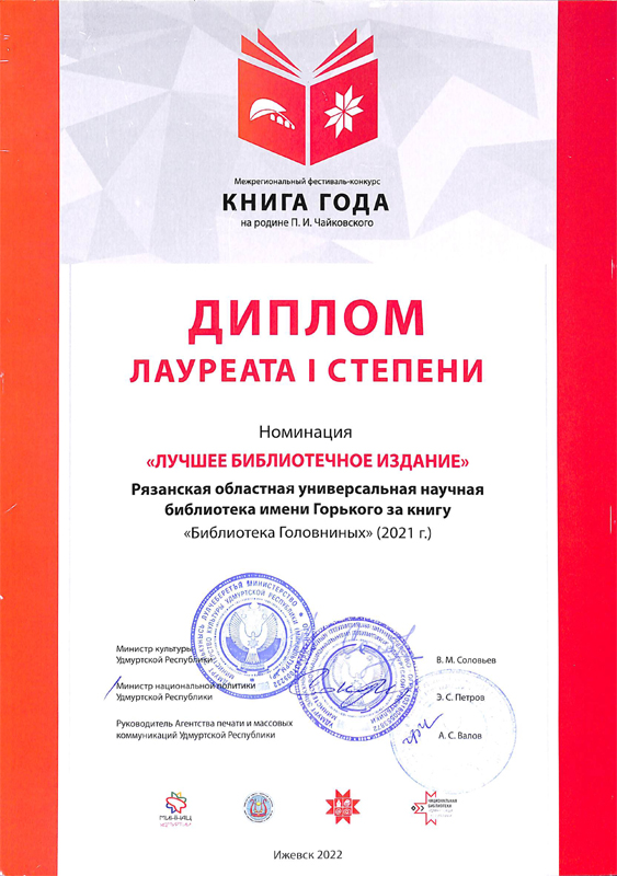 С 2015 года Рязанская областная универсальная научная библиотека имени Горького вела научно-исследовательскую работу по реконструкции библиотеки представителей древнего дворянского рода Головниных – вице-адмирала, общественного и государственного деятеля, уроженца Рязанской земли Василия Михайловича Головнина и его сына, министра народного просвещения России Александра Васильевича Головнина.