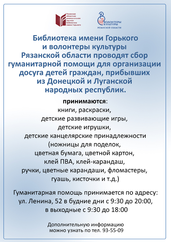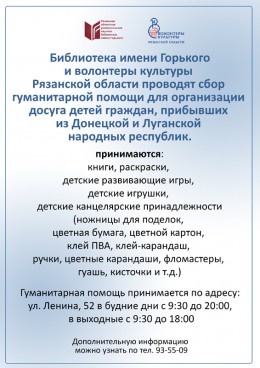 Библиотека имени Горького и волонтеры культуры Рязанской области проводят сбор гуманитарной помощи для организации досуга детей граждан, прибывших из Донецкой и Луганской народных республик