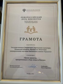 В номинации «Яркие проекты, приуроченные к Году семьи в России» библиотека имени Горького отмечена грамотой Министерства культуры Российской Федерации за организацию и реализацию масштабных и успешных проектов, направленных на продвижение семейных ценностей и традиций. Награду директору библиотеки вручили заместитель директора департамента региональной политики, образования и проектного управления Министерства культуры Российской Федерации Жанна Владимировна Алексеева и Президент Российской библиотечной ассоциации, генеральный директор Российской государственной библиотеки Вадим Валерьевич Дуда.