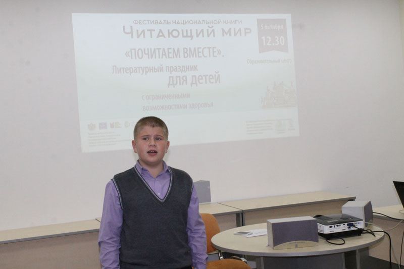 Много радостных минут фестиваль «Читающий мир» подарил детям с ограниченными возможностями здоровья. Учащиеся школы №23 пришли в библиотеку нарядные, все они приготовились к чтению стихов С.А. Есенина. Читали с удовольствием! Некоторые из присутствующих на празднике детей первый раз выступали публично на открытой площадке, многие из них только-только переступили порог школы, учась до этого на дому.