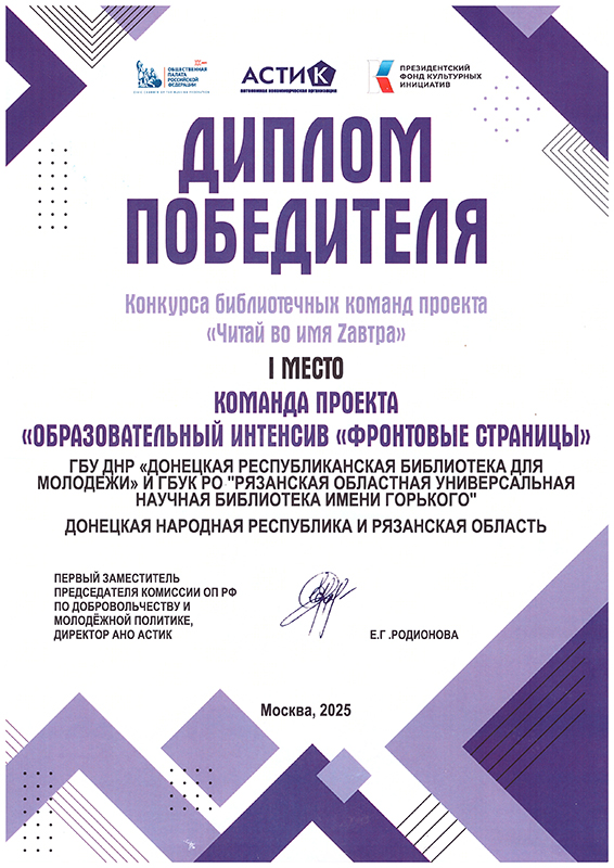 Проект «Фронтовые страницы», разработанный совместно Рязанской областной универсальной научной библиотекой имени М. Горького, Луганской молодёжной библиотекой и Донецкой республиканской библиотекой для молодёжи, занял I место.