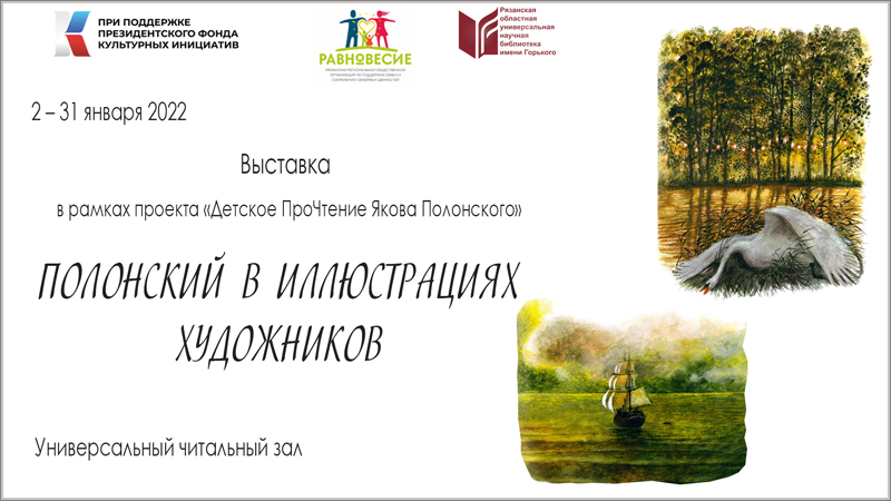 2 января в Рязанской областной универсальной научной библиотеке им. Горького открылась выставка «Полонский в иллюстрациях художников», подготовленная в рамках проекта «Детское ПроЧтение Якова Полонского» Рязанской региональной общественной организации по поддержке семьи и сохранению семейных ценностей «Равновесие». Проект поддержан в 2021 году Президентским фондом культурных инициатив.