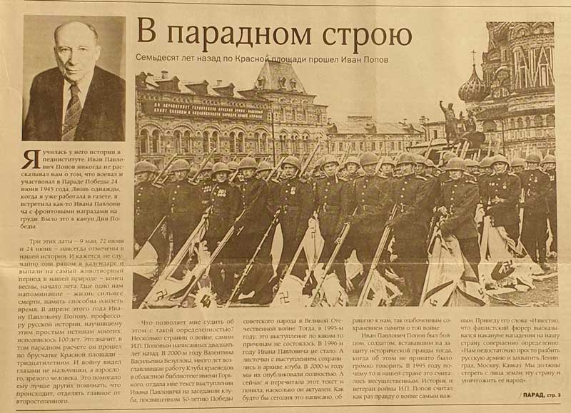 Благодаря большой краеведческой работе, проделанной по разысканию участников исторического парада, областная газета, теперь уже «Рязанские ведомости», в 2011, 2015, 2016 и 2018 годах публиковала репортажи о семнадцати моряках-рязанцах, об участнике боев под Ленинградом и в Заполярье, докторе исторических наук, профессоре Иване Павловиче Попове (1915 – 1996), о фронтовике-подводнике Владимире Федоровиче Феофанове (р. 1916), о полном кавалере ордена Славы, механике-водителе боевого легендарного танка Т-34 Иване Ивановиче Закомолдине (1916 – 1989).