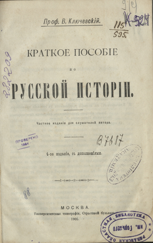 По материалам статьи: Толстов В. А. Ключевский Василий Осипович : (к 175-летию историк, академика, председателя Императорского Общества истории и древностей российских, действительного члена Рязанской ученой архивной комиссии) // Календарь знаменательных и памятных дат Рязанской области на 2016 год / РОУНБ имени Горького. – Рязань : ГУП РО «Рязанская областная типография», 2016. – С. 58-68. – Библиогр.: с. 68-69.