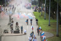 Более 200 велосипедистов и самокатчиков проехали с флагами родной страны по территории Лесопарка от входа до разворотного круга перед пристанью в районе дебаркадера и обратно.
