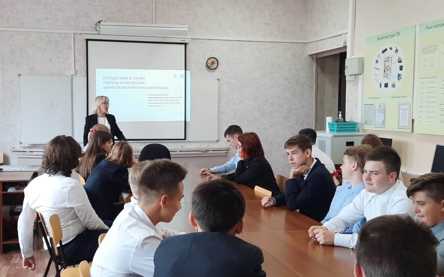 В рамках просветительской акции руководитель Центра грамотности Библиотеки имени Горького Ольга Уласевич поделилась своими знаниями в области русского языка с учащимися школы №8 города Рязани, представив лекцию «Путешествие в слово: секреты этимологии заимствований в русском языке».