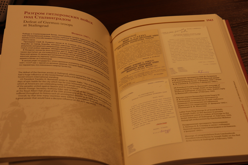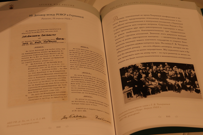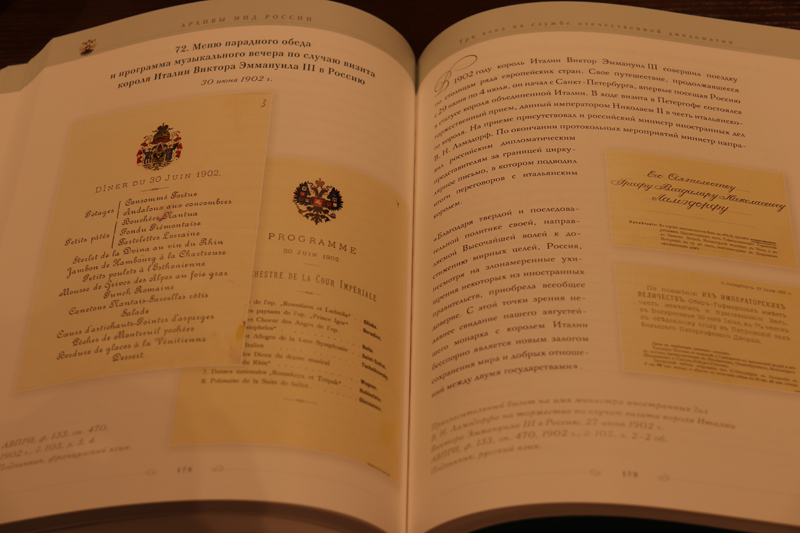Михаил Российский представил в своей лекции два издания, которые переданы в дар библиотеке им. Горького. Юбилейное издание «Архивы МИД России: три века на службе отечественной дипломатии» приурочено к 300-летию создания архива внешнеполитического ведомства России. В альбоме представлены исторические документы, которые являются бесценным национальным достоянием, обеспечивают связь времен и поколений. По словам Михаила Российского, работа с такими документами позволяет противостоять попыткам сфальсифицировать прошлое, помогает воссоздавать его объективную картину, поскольку документ – это научный факт, и спорить с ним невозможно.