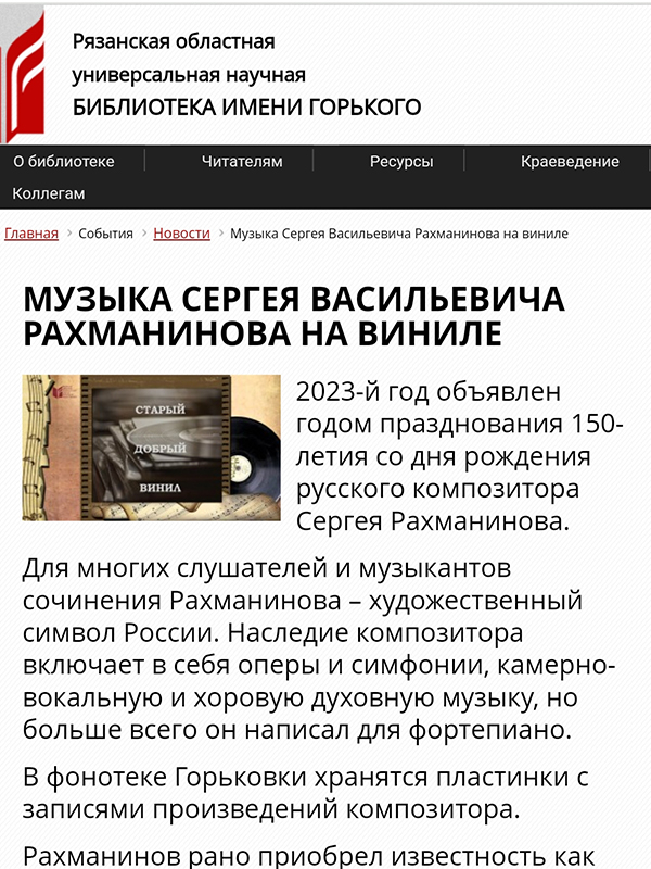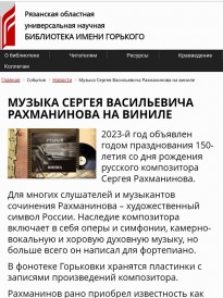 На сайте библиотеки опубликован видеоролик «Музыка Сергея Васильевича Рахманинова на виниле». Читатели виртуально знакомятся с творческим наследием Рахманинова на виниловых дисках, которые бережно хранятся в библиотеке. На грампластинках можно услышать записи сочинений композитора в исполнении Федора Лузанова и Евгения Светланова, Святослава Кнушевицкого и Льва Оборина, Ван Клиберна и оркестра Московской филармонии, Лазаря Бермана и Владимира Горовица с Лондонским симфоническим оркестром.