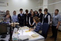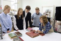 Художники-реставраторы продемонстрировали приемы классической листовой реставрации и восстановления переплетов, познакомили с процессом переплета книг массового спроса, показали отреставрированные книги. Специалисты по превентивной консервации рассказали учащимся об изготовлении контейнеров из бескислотного картона для предохранения книг от воздействия окружающей среды; капсул из специальной полиэфирной пленки для хранения листовых документов.