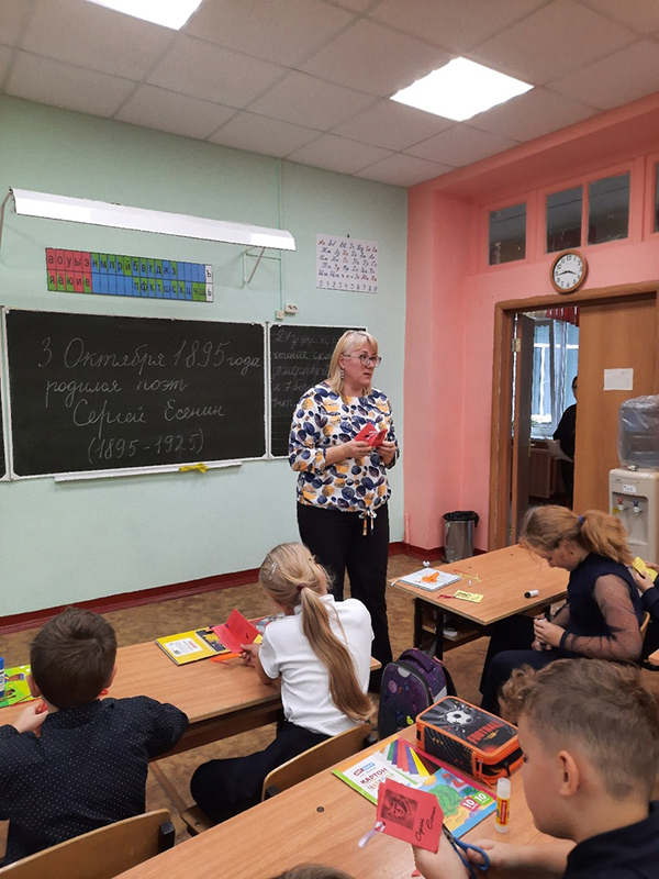 Ко дню рождения Есенина сотрудники Центра литературы по искусству провели для учеников 4 класса школы № 36 г. Рязани мастер-класс по изготовлению миниатюрной книги. Ребятам предложили из листа бумаги и ножниц собрать за урок настоящую книгу с известными стихами Есенина.