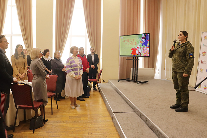 Директор библиотеки, председатель Общественной палаты Рязанской области, председатель регионального отделения Союза женщин России Наталья Николаевна Гришина сердечно поздравила гостей с наступающим праздником. Она поблагодарила всех за большой вклад в самое главное дело, которым живет сейчас Союз женщин – организацию помощи воинам СВО, работу по сбору посылок, поддержку семей военнослужащих.
