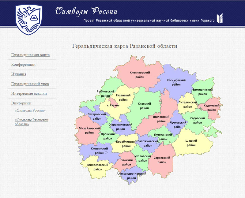 «Сердцем» проекта «Символы России» стала геральдическая карта Рязанской области. Она представляет собой совокупность изображений и описаний официальных символов муниципальных образований и сельских поселений, созданных членом Геральдического совета при Президенте Российской Федерации, заслуженным художником РФ М.К. Шелковенко. Не все субъекты Рязанской области имеют официальные регалии, поэтому Михаил Константинович продолжает работу по их созданию, а библиотека имени Горького дополняет свой ресурс вновь появившимися символами.