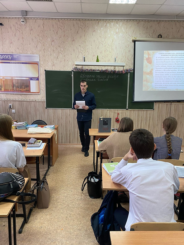 27 декабря на территории муниципального бюджетного общеобразовательного учреждения «Школа №19(25) имени вице-адмирала В.М. Головнина» заведующий сектором «Книга Памяти Рязанской области» отдела молодежных проектов и волонтерской деятельности библиотеки им. Горького Дмитрий Андреевич Винокуров провел открытый урок на тему человеческого подвига по произведению А.А. Федеева «Молодая гвардия».