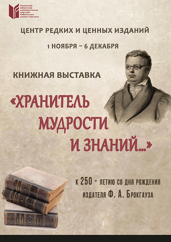 В читальном зале центра редких и ценных изданий открылась книжная выставка, подготовленная к 250-летию со дня рождения Фридриха Арнольда Брокгауза. Он вошел в историю как самый известный немецкий издатель, типограф, основатель издательской фирмы «Брокгауз» и многотомного энциклопедического словаря Фридриха Арнольда Брокгауза.
