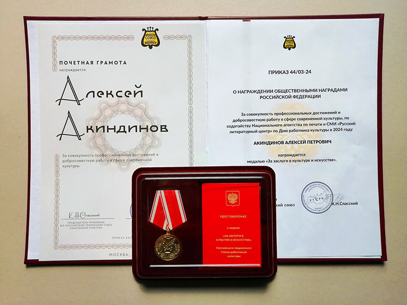 Рязанский живописец, член Союза художников России и Российского Союза профессиональных литераторов Алексей Акиндинов завоевал в Москве медаль «За заслуги в культуре и искусстве». Торжественное награждение состоялось 20 апреля в Центральном Доме архитектора. Медаль учреждена Российским творческим Союзом работников культуры и является общественным наградным знаком, который полагается за создание арт-экспозиций, театральных спектаклей, кино- и телефильмов, литературных и музыкальных произведений, концертных и шоу-программ и произведений искусства. Также медалью могут быть удостоены представители научной и образовательной областей за выдающийся вклад в изучение, сохранение и популяризацию российской художественной культуры.