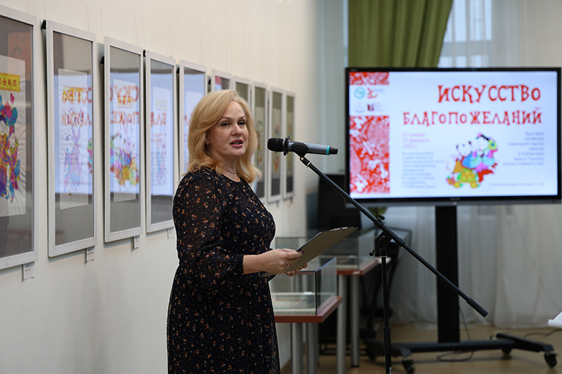 С наступлением китайского Нового года поздравила гостей директор Института Конфуция с российской стороны Елена Леонидовна Марьяновская, которая выступила инициатором выставочного проекта. По ее словам, экспозиция позволит не только приобщиться к китайским традиционным ценностям, но и по-новому взглянуть на свою культуру.