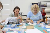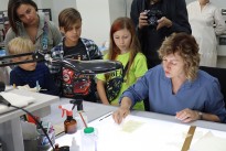 В ходе мастер-классов специалисты провели обзорную экскурсию по центру и показали участникам полный цикл реставрационных работ по восстановлению бумажных документов: обследование документа, механическую и водную очистку, укрепление разрывов и восполнение утрат бумажной основы на реставрационном столе с подсветом.