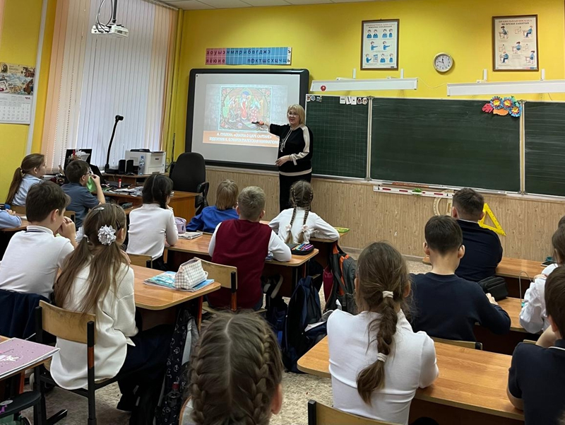 Ученики 4 класса школы № 36 г. Рязани во время литературно-музыкальной встречи «Образ матери в искусстве», которую подготовили и провели сотрудники Центра литературы по искусству, познакомились с портретами красавиц в произведениях устного народного творчества, русской поэзии, мировой живописи и на портретах известных русских художников. Особый интерес вызвала картина Виктора Иванова, в творчестве которого часто встречается образ женщины-матери. В своем знаковом полотне «Молодая мать» художник воплотил национальный тип женщины – хранительницы семейного очага.